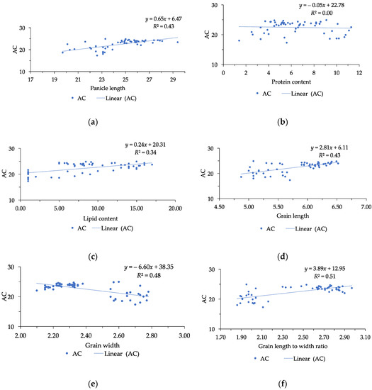 - Lou, J.; Chen, L.; Yue, G.; Lou, Q.; Mei, H.; Xiong, L.; Luo, L. QTL mapping of grain quality traits in rice. J. Cereal Sci. 2009, 50, 145–151. [Google Scholar] [CrossRef]