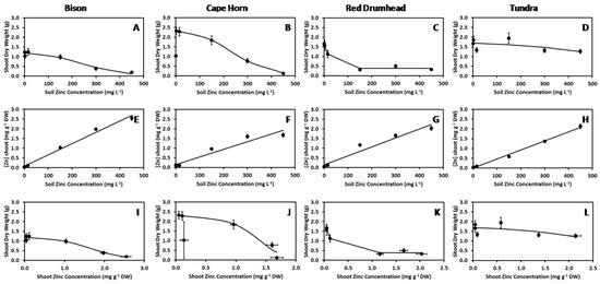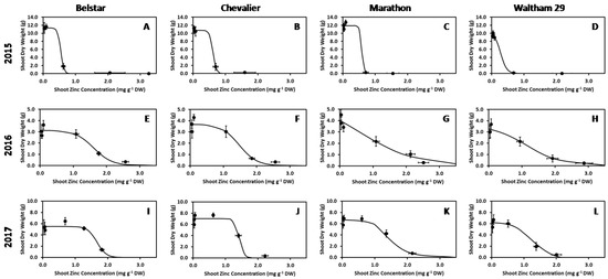 Relationship between shoot zinc concentration (Zn) and shoot dry weight (DW) of (A,E,I) Belstar, (B,F,J) Chevalier, (C,G,K) Marathon and (D,H,L) Waltham 29 broccoli genotypes grown in 2015 (top row), 2016 (middle row) and 2017 (bottom row). Regression lines are fitted to the equation DW = a/(1 + EXP(b*((Zn) − c))) + d, where the minimum biomass equals d, the maximum biomass equals a + d, c is the substrate Zn concentration at the point of inflection and the slope of the relationship at the point of inflection is given by −ab/4. For all lines d = 0 and a is the maximum shoot biomass. Parameters a, b and c were: (A) a = 11.3, b = 20.3, c = 0.542 for Belstar in 2015, (B) a = 10.7, b = 19.5, c = 0.612 for Chevalier in 2015, (C) a = 11.9, b = 30.8, c = 0.585 for Marathon in 2015, (D) a = 10.4, b = 10.5, c = 0.272 for Waltham 29 in 2015, (E) a = 3.13, b = 3.63, c = 1.61 for Belstar in 2016, (F) a = 3.69, b = 3.75, c = 1.47 for Chevalier in 2016, (G) a = 5.97, b = 1.19, c = 0.596 for Marathon in 2016, (H) a = 3.64, b = 1.89, c = 1.14 for Waltham 29 in 2016, (I) a = 5.51, b = 7.17, c = 1.66 for Belstar in 2017, (J) a = 7.02, b = 13.1, c = 1.42 for Chevalier in 2017, (K) a = 6.70, b = 3.66, c = 1.53 for Marathon in 2017, (L) a = 6.24, b = 4.05, c = 1.20 for Waltham 29 in 2017. Data are shown as the mean and standard error of the mean (Table S1).