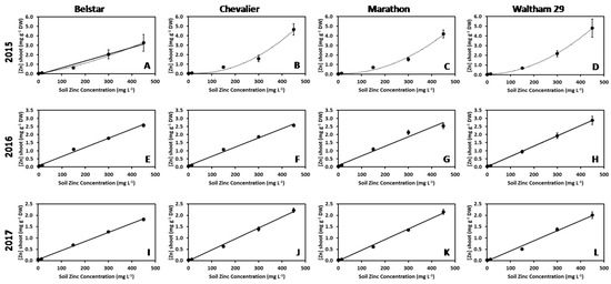 Relationship between substrate zinc (Zn) concentration and shoot Zn concentration of (A,E,I) Belstar, (B,F,J) Chevalier, (C,G,K) Marathon and (D,H,L) Waltham 29 broccoli genotypes grown in 2015 (top row), 2016 (middle row) and 2017 (bottom row). Parameters for linear regression lines are given in Table 2. Data are shown as the mean and standard error of the mean (Table S1).