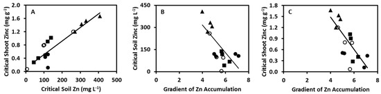 Relationship between (A) critical shoot zinc (Zn) concentrations and critical substrate Zn concentrations, (B) critical substrate Zn concentrations and the linear rates of change of Zn uptake with increasing substrate Zn concentration and (C) critical shoot Zn concentrations and the linear rate of change of Zn uptake with increasing substrate Zn concentration among four genotypes of broccoli studied in 2015 (closed circles), 2016 (squares) and 2017 (triangles), and four genotypes of cabbage studied in 2014 (open circles). The regression line in panels A (y = 4.09x + 101 mg kg−1/mg L−1, R2 = 0.840, n = 12) and B (y = −0.438x + 3.232, R2 = 0.640, n = 12) and C (y = −93.96x + 693.2, R2 = 0.585, n = 12) are for broccoli only. Data are presented in Table 1 and Table 2.