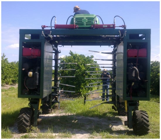- Roka, F.M.; Ehsani, R.J.; Futch, S.H.; Hyman, B.R. Citrus Mechanical Harvesting Systems—Continuous Canopy Shakers. Gainesville: University of Florida Institute of Food and Agricultural Sciences. 2014. Available online: http://edis.ifas.ufl.edu/pdffiles/FE/FE95100.pdf (accessed on 12 August 2017).