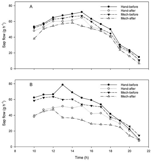 Effect of harvesting methods (Hand and mechanical canopy shaker) on hourly sap flow measurements in (A) and (B) experiments before and after harvesting respectively at the commercial site in southwest Florida during 2015.