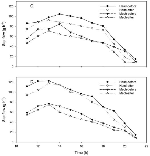 Effect of harvesting methods (Hand and mechanical canopy shaker) on hourly sap flow measurements in (C) and (D) experiments before and after harvesting respectively at the commercial site in southwest Florida during 2016.