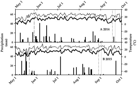 May–September 2014 (A) and 2015 (B): precipitation (solid vertical bars), daily maximum temperature (black dotted line), daily minimum temperature (solid black line), planting date (gray vertical dashed line), harvest date (gray vertical dotted-dashed line), post-harvest soil sample date (gray vertical dotted line).