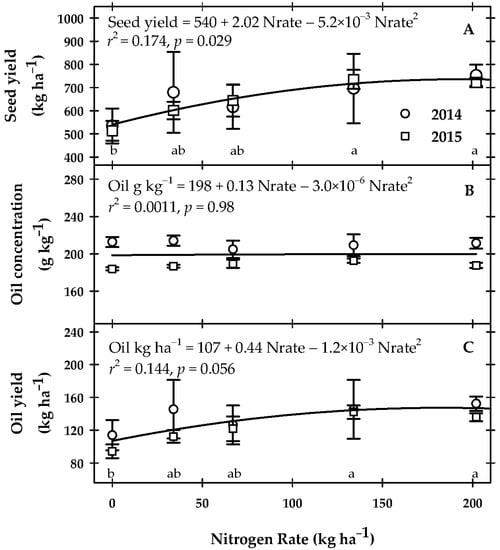 Calendula seed yield at 0% moisture (A), seed oil concentration (B), and oil yield (C) as a function of N fertilizer rate. Quadratic equations shown were calculated using regression analysis with data from both years (n = 40). Open circles represent 2014 and open squares represent 2015 treatment means with standard error bars (n = 4). Letters at the bottom of each graph denote the significance among N rates.