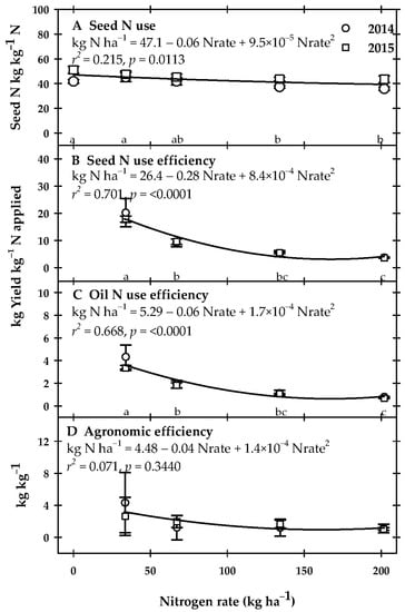 Calendula seed nitrogen (N) use (A), seed N use efficiency (B), oil N use efficiency (C), and agronomic efficiency (D). Quadratic equations shown were calculated using regression analysis with data from both years (n = 40). Open circles represent 2014 and open squares represent 2015 treatment means with standard error bars (n = 4). Letters at the bottom of each graph denote the significance among N rates.