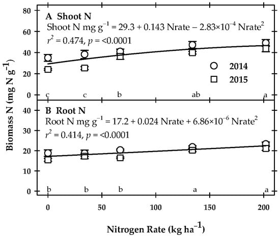 Calendula shoot (A) and root (B) tissue N concentration of samples collected in July when plants were transitioning from vegetative to reproductive growth. Quadratic equations shown were calculated using regression analysis with data from both years (n = 40). Open circles represent 2014 and open squares represent 2015 treatment means with standard error bars (n = 4). Letters at the bottom of each graph denote the significance among N rates.