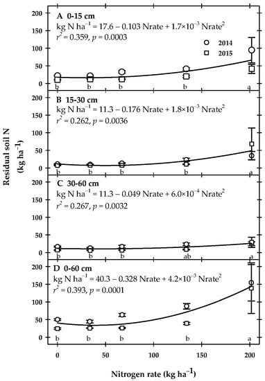 Residual soil N (kg N ha−1) at 0–15 (A), 15–30 (B), 30–60 (C), and 0–60 cm (D) profile intervals following calendula harvest in 2014 and 2015. Quadratic equations shown were calculated using regression analysis with data from both years (n = 40). Open circles represent 2014 and open squares represent 2015 treatment means with standard error bars (n = 4). Different letters at the bottom of each graph denote significance among N rates p ≤ 0.05.