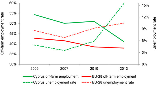Cyprus and European Union (EU)-28 off-farm employment and unemployment rates, 2005–2013. Sources: European Commission [14]; Eurostat [15].