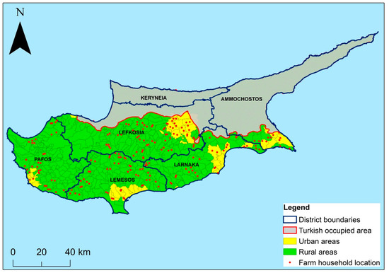The farm household survey was implemented between January and May 2013 in the five districts of Cyprus, namely, Lefkosia, Lemesos, Larnaka, Pafos, and Ammochostos. Farm households were identified in each district through census data [28]; a sample of 200 farm households, that is, 0.5% of the total number of farm households in Cyprus, was randomly selected across the five districts. The distribution of the surveyed farm households by district and rural/urban areas is presented in Figure 2. The definition of rural/urban areas in Cyprus follows the regional typology definition of the Organisation for Economic Co-operation and Development (OECD) [29], which is based on the population density criterion. For more details on the definition of rural areas in Cyprus, see Giannakis [30].