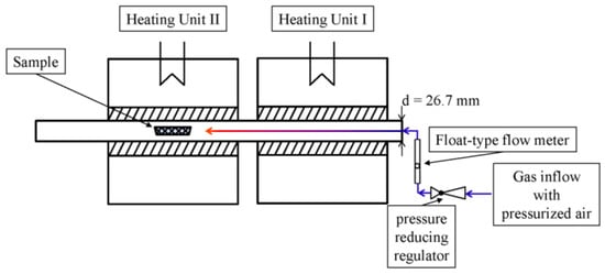 A heating experiment was carried out at Fraunhofer Institute for Environmental, Safety, and Energy Technology UMSICHT, Germany to investigate how the seed germination was affected by different temperatures and exposure times. A double-tube heating unit with a glass tube inside was used. We used an electrical heating unit Carbolite Type HST 12/200 (Carbolite Gero Ltd., Hope, Hope Valley, UK) providing a maximum temperature of 1200 °C and a power of 1000 W. Vessels made from two different types of metal meshes (A and B; see Chapter 2.5) were used to bring the seeds in the tube where the seeds were exposed to the heat. The air pressure and flow were controlled by a regulator, and the volume flow was measured with a flow meter and adjusted with a needle valve. We used ambient air. The pressurized air was heated by ‘Heating Unit I’ (Figure 1). The ‘Heating Unit II’ provided the energy for a radiative heat transfer. This evokes a combination of radiative and convective heat transfer onto the seeds (Figure 1).