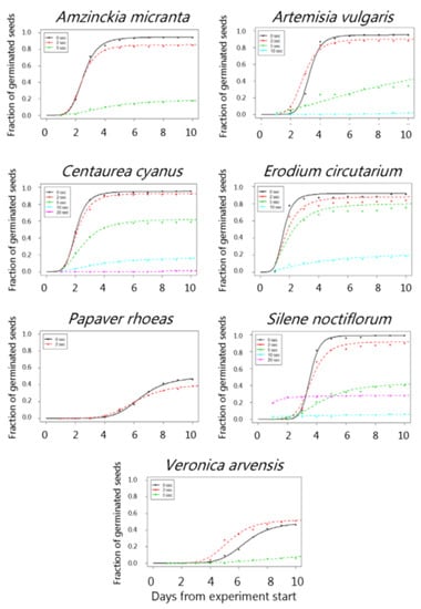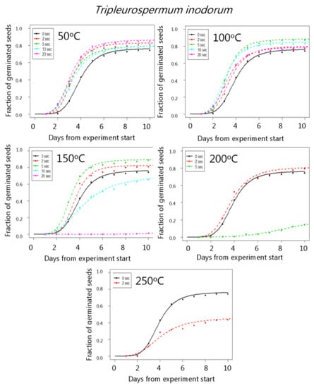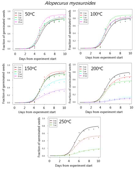 We terminated the experiments after 14 days for all species. For most plant species, The International Seed Testing Association (ISTA) [18] recommends duration of 10–14 days, but for some species, it is appropriate to increase the duration of the germination test. The germination was reduced significantly if seeds were treated with high temperatures (200 °C and 250 °C) and the longest durations (10 and 20 s), but the germination curves were less precisely estimated (large standard errors of the parameter, Table 3). A longer duration of the experiments with more observations would probably have improved the estimation of the curve parameters. However, the effects of increasing durations are seen in Table 3 and Figure 2, Figure 3 and Figure 4.