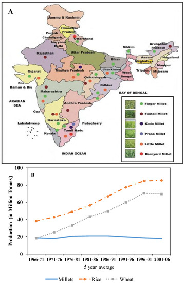 Millets are one of the oldest agronomic group of grasses that serve as a nutritious staple food in Asia [1]. The small millet variants are particularly suited to the Indian climate, due to their resilience and ability to grow under marginal soil fertility and moisture conditions. Therefore, different varieties can be found in several geographic regions of the country [2] as shown in Figure 1A. Before the Green Revolution in India in the mid-1960s, small millets made up more than 40% of all cultivated grains in an agriculture industry that contributed more than 50% to the Indian GDP [3]. Nutrition-wise, small millets are rich in polyphenols, antioxidants, and fibers that are important for healthy body functioning [4]. They also have the lowest glycemic index when compared to other cereals, such as rice and wheat, and has no gluten [5,6,7]. In addition, cultivation of this crop has been recently shown to have the lowest global warming potential when compared to wheat, rice, and maize [8].