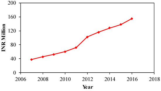 At present, small millets average 70 Rs/kg compared to the average price of 40 Rs/kg of rice, highlighting constraints in affordability. Fortunately, the potential for small millets value chain agribusinesses to grow in the Indian economic climate exists, due to the opportunities created by an increasing average disposable income [14] as shown in Figure 2. Although in India, food allocation from disposable income is approximately 41% [15], increasing apparent wealth has been shown to lead to an increase in income allocation for food, and a drive towards healthy lifestyles [16]. Small millets can therefore benefit from a higher purchasing power especially as it is indeed a healthy alternative. Unfortunately, stagnation in the value chain prevents the market from tapping into this economic opportunity. A demonstration of this can be seen in a steady increase in the demand for the “highly nutritious” quinoa, which is not traditionally grown in India [17], but is gaining popularity, due to its tag as a superfood and adoption by Western countries. Interestingly, quinoa has a similar nutritional profile to those of small millets [17], but small millets are being overlooked by the emerging market due to their weak value chain.