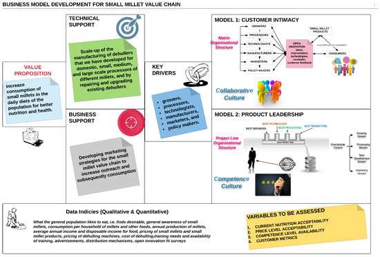 Using the data from the market analysis in the business model canvas, it appears that the small millets value chain development should be done with a CI–PL business model mix, especially since there are well-established alternatives (rice and wheat) in the Indian market. This model mix opens up the opportunity for the development of a unique incubator-style, open innovation-driven business model. This model will be unique to the small millets industry, because it allows for open information sharing and collaborative work between the major players of the value chain in a culture (Indian) that is typically segregating. In this proposed approach, growers, technologists, processors, and researchers will be working in a collaborative environment of producing, innovating, learning, and sharing knowledge, to improve market penetration of high-quality small millets and value-added products through innovation and technology. In this network, agribusinesses will be supported to improve yield, reduce drudgery, and improve marketing. As shown in the cluster map, these industries/components of the small millets value chain are not succeeding on their own, and this model will give them a chance to improve through the stimulations, supports, and collaborations that it fosters. Also, care will be taken to ensure minimal societal resistance that may arise with the agricultural innovation in developing climes [20]. The success of this model, therefore, relies a lot on the capabilities of the cluster heads, a reduced societal resistance and very importantly, the degree of coordination within the local domain.