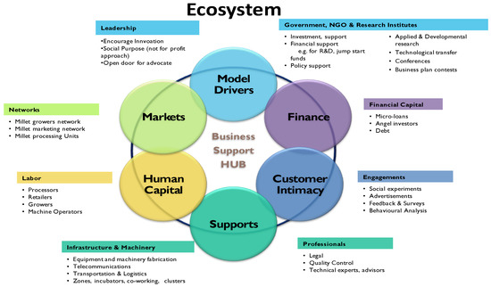 Open innovation supported business models are increasingly being developed for Agrifood business chains. Although this approach is not as common as can be found in the electronic (GE, Samsung) or manufacturing (LEGO) industries [21,22]. Case studies of the Hungarian Wine Sector [23] and the Coconut Growers Association in Trinidad and Tobago [24] are examples of success stories that can be looked at as examples. A case study that bears some striking similarities to the proposed model to improve the small millets value chain in India is Unilever. Unilever focuses on international markets in developing countries and its operation, product development, and innovation is driven by customer preferences. In their ecosystem cluster, other components include suppliers and universities, and they have been able to achieve tremendous success. These model parameters are to be examined with a customized survey which will be carried out to acquire stakeholders’ views, gain more knowledge on the current small millets value chain, and identify innovation issues that need to be tackled. The customized survey will also aim at classifying the current stakeholders into functional categories (e.g., growers, processors, marketers, etc.), acquire their business goals and objectives, ownership structure, employee strength, access to information capital requirements, and incentives needed. Surveys may be carried out according to any international surveying guides.