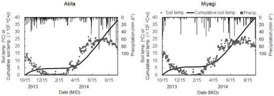 Seasonal changes in the daily (plot) and cumulative soil temperature (line) and precipitation (bar, °C·d: degree Celsius day). The precipitation data were obtained using an automated meteorological data acquisition system (AMeDAS) near each experimental field. The soil temperature was measured at a depth of 5 cm and 7.5 cm (center of 15 cm corresponding to plowed layer) from the soil surface inside the plot using a temperature logger (Ondotori TR-71U, T&D Corporation, Matsumoto, Japan) during the fallow and growing season, respectively. The soil temperature was measured with four replications, regardless of the N-fertilizer type at both sites.