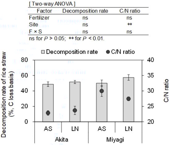 Decomposition rate (C loss basis) and C/N ratio of rice straw before cultivation. AS, ammonium sulfate; LN, lime nitrogen. The error bars show the standard error (n = 4).
