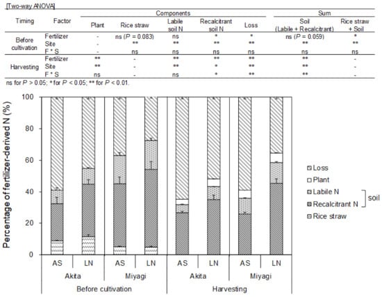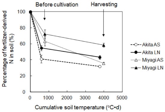 At harvesting, the percentages of N in plant and soil (including labile and recalcitrant) derived from LN were significantly higher than those from AS in both Akita and Miyagi with different climates (Figure 3). This implies that the results of this study could be applied throughout northern Japan.