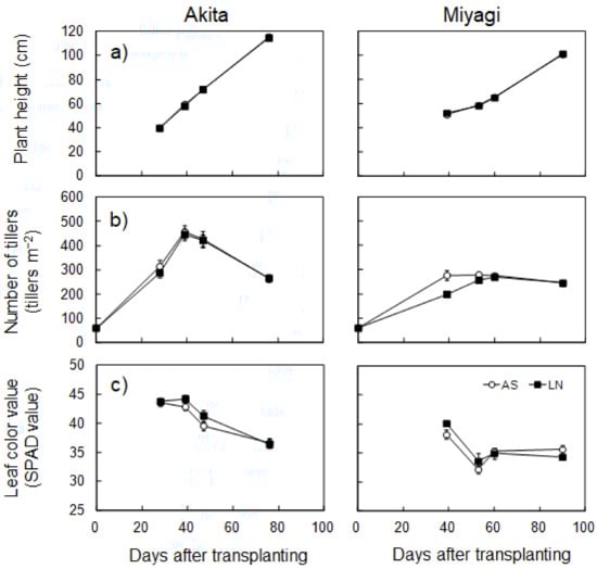 Changes in the plant height, the number of tillers and the leaf color value (also known as the SPAD value) with time are shown in Figure 4. No significant differences in those parameters with fertilizer at any measurement time were found. Significant differences in the plant height were not observed with fertilizer throughout the growing season. The number of tillers with fertilizer in Akita showed a similar trend throughout the growing season, and the number of panicles at the full heading stage with fertilizer also was not significantly different. Although the number of tillers in Miyagi was higher in the AS than in the LN at the tillering stage, the number of tillers at the maximum tiller number stage and the number of panicles at the full heading stage with fertilizer were similar. The SPAD value in Akita was higher for LN than AS at the maximum tiller number and panicle initiation stages with fertilizer and similar at the full heading stage. The SPAD value in Miyagi was higher for LN than AS at the tillering stage and did not differ with fertilizer.