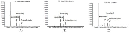GC-MS total ion chromatogram of endosulfan in soil, ginseng leaf·stem, root samples (fortification level: LOQ × 50). ((A) Soil samples; (B) ginseng leaf·stem samples; (C) ginseng root samples).