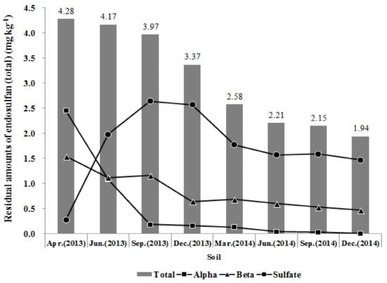 The residual amounts of endosulfan (total) in soil are presented in Figure 3. In this study, initial level of retention of endosulfan (total) in soil in April was 4.28 mg kg−1 which was an approximation to the level of artificial treatment (5.0 mg kg−1), and the retention measured by each quarter were 4.17 mg kg−1 (June 2013) and 1.94 mg kg−1 (December 2014) showing a decreasing tendency (but insignificant) after a certain duration of time. The level of retention of α-endosulfan and β-endosulfan has decreased but the level of retention of endosulfan-sulfate which is the main metabolite showed temporary increase followed by subsequent decrease. Endosulfan is stable in light and its solubility in water is low (α-endosulfan 0.32 mg L−1, β-endosulfan 0.33 mg L−1) [1]. The level of its coefficient of adhesion to soil is approx. 11,000 and thus it tends to be remaining in soil strongly and would generate its metabolite, the endosulfan-sulfate, through the oxidation of sulfur contained therein induced by microbes [15,21]. The decomposition half-life of endosulfan (total) varies according to ratio of isomers and environment and, depending on the process of metabolism, the length of half-life spans from 30 days to maximum 6 years [22,23]. Further, environmental factors such as concentration, ionic strength, pH, surface loading, type of sorbent, and time also all affect the type of sorption complex [24]. Thus, the level of retention of endosulfan (total) in soil may decrease continuously due to its physicochemical properties, however, the resulting consequence of decrease in level of retention is expected to be insignificant.