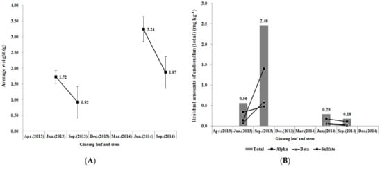 The specimens of ginseng were divided into aerial and radix parts to examine the translocation of endosulfan (total) from soil to ginseng. The average weight leaf and stem of ginseng and residual amounts of endosulfan (total) in soil are shown in Figure 4A,B. Specimens of the leaf and stem of ginseng were collected in June and September by taking the growth phase of ginseng into account, and the analyzed level of retention of endosulfan (total) were initially 0.56 mg kg−1 (June 2013) and 2.46 mg kg−1 (September 2013) and then they became 0.29 mg kg−1 (June 2014) and 0.18 mg kg−1 (September 2014). The level of retention of endosulfan (total) in the specimens of leaf and stem of ginseng collected in 2013 tended to increase but, the level of retention of endosulfan (total) in the specimens of leaf and stem of ginseng collected in 2014 was lower than the specimens collected in 2013. Besides, the specimens collected in September in 2013 and in 2014 were concluded that they would be inappropriate to derive tendencies of the varied retention of endosulfan (total), therefrom, because the early defoliation owing to the growth phase of ginseng coincided with the season. However, the specimens collected in June 2013 and in 2014 revealed the varied level of retention of endosulfan (total) in specimens collected in 2014 decreased by approx. twice as much as the level of retention of endosulfan (total) in specimens collected in 2013. Consequently, it concluded that it would be attributable to the growth of the aerial part of ginseng from the second to the third year resulted in increased length and width (plant height, stem length, stem diameter, leaf area, etc.).