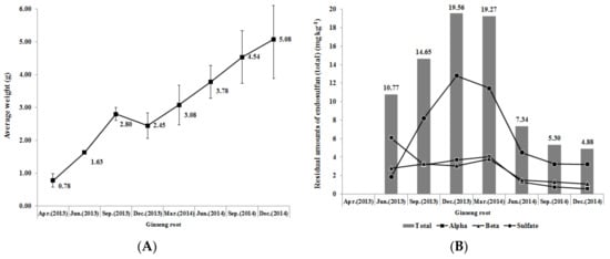 (A) Variation of ginseng root samples weight during experimental periods; and (B) residual amounts of endosulfan in ginseng root samples. Total: alpha (mg kg−1) + beta (mg kg−1) + sulfate (mg kg−1).