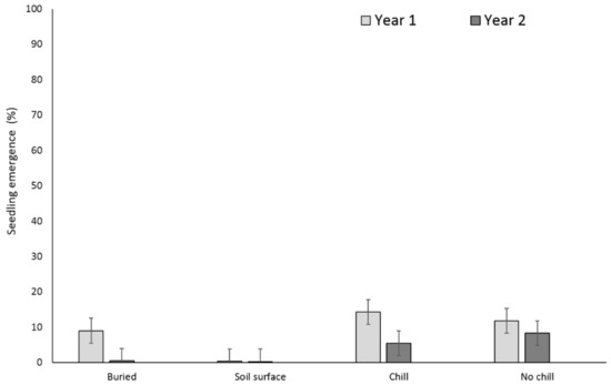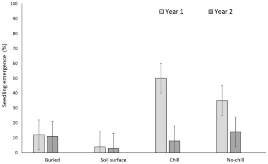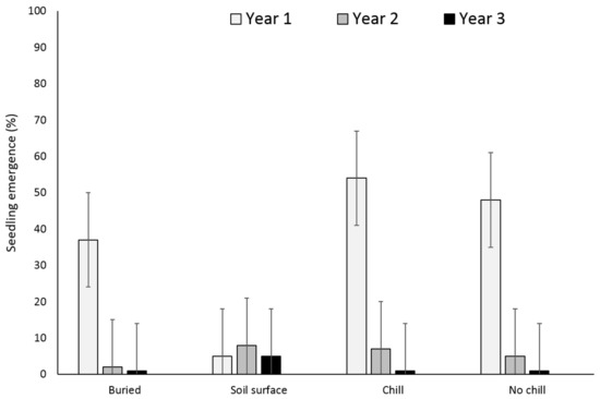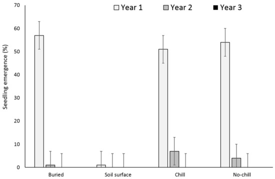 In addition, research has been conducted to characterize how tillage systems affect seedling emergence patterns [12,13,14,15]. The magnitude of X. strumarium emergence is influenced by tillage, crop presence and various interspecific competition regimes [16,17]. Tillage increases X. strumarium and S. obtusifolia seedling emergence through soil aeration and increased temperature [18]. Under tilled conditions Bararpour and Oliver [16] reported 11% seedling emergence for both species, in relation to the initial seedbank, the first year of seed deposition. On the contrary, seedling emergence under no-tilled conditions was reduced to 0.7% and 1.6% for X. strumarium and S. obtusifolia, respectively. These authors also recorded high seed deposition for both species, even when they were grown under intra- and interspecific competitive conditions for two consecutive years. However, since weed seeds persist in the soil, understanding seedbank dynamics over multiple years is important for devising multiyear strategies to manage weeds. The purpose of this paper is to investigate how simulated tillage strategies (buried vs. unburied) in combination with chill or no chill conditions can affect the soil seedbank of both X. strumarium and S. obtusifolia. In addition, to examine the seed survival mechanisms when seeds for both X. strumarium and S. obtusifolia originated from single or multiple parental plants.