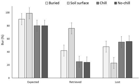 Effect of environmental conditions on X. strumarium bur loss originating from a single maternal source after three years. Vertical bars represent LSD at 5% significance level. Expected is the sum of non-germinated seeds.