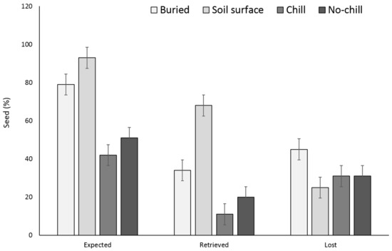 Effect of environmental conditions on X. strumarium bur loss originating from a multiple maternal source after two years. Vertical bars represent LSD at 5% significance level. Expected” is the sum of non-germinated seeds.