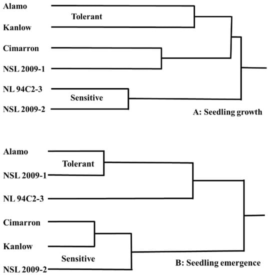 The dendrogram and cluster of six switchgrass cultivars were obtained based on the Ward linkage method and squared Euclidian distance on the means of the salt tolerance indices for four multivariate parameters at seedling growth and emergence stages (Figure 1). ‘Alamo’ and ‘NSL 2009-2’ switchgrasses were consistently clustered as the most tolerant and the least tolerant cultivars, respectively, at both seedling growth and emergence stages. However, other tested switchgrass cultivars responded differently from one stage to another. ‘NSL 2009-1’ and ‘NL 94C2-3’ were within the same group as ‘Alamo’ at the seedling emergence stage, but classified into the group of ‘NSL 2009-2’ at the seedling growth stage. On the other hand, ‘Kanlow’ and ‘Cimarron’ stayed in the same group as ‘NSL 2009-2’ at the seedling emergence stage, but were categorized in the group of ‘Alamo’ at the seedling growth stage. These results agree with previous reports by Tober et al. [21], Fan et al. [23], and Liu et al. [24], who reported that the salt tolerance of switchgrass varies with cultivar and growth stage. All of these reports suggest that plant physiological adjustment to salinity stress involves trade-offs at different stages, for example, between seedling emergence and seedling growth [36].