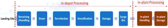 Conventional woody biomass logistics use the existing local infrastructure for feedstock resources. Wood is harvested and dried prior to collection. Dried wood is comminuted at the landing and loaded into trucks for transportation either to a trans-load terminal or directly to the power plant. When received at the power plant, the chips are cleaned, dried, and fed into the conversion process through combustion. As an alternative to the conventional system, the Idaho National Laboratory (INL) suggested advanced woody feedstock logistics [25]. A key feature of this advanced design is the integration of a local biomass-processing depot where the biomass is torrefied and densified prior to transportation to the plant, as shown in Figure 1.