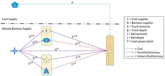Figure 2 shows basic sets and decision variables for the mathematical model used in the research. As shown, biomass shipments for non-torrefied (N) and torrefied (T) biomass are considered separately. and indicate the truck flow of biomass transported from supplier (feedstock origin) to truck terminal or depot, respectively. and represent the truck flow of biomass transported from supplier to rail terminal or depot, respectively. shows the direct trucking flow of biomass transported from supplier to power plant. In addition, and indicate the truck flow of biomass transported from truck terminal and depot to power plant, respectively and for rail transportation, and show the biomass flow transported from rail terminal and depot to power plant, respectively. Please note that the two flows shipped through depots ( and ) are torrefied woody biomass. A flow of coal from existing coal supplier to power plant is expressed by .