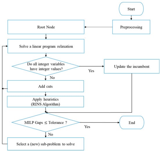 In this study, we use the MILP solver of IBM ILOG CPLEX Optimization Studio 12.7 with Python API (Application Programming Interfaces), which is based on the dynamic search algorithm. The dynamic search algorithm in CPLEX basically consists of four blocks to solve large scale MILP problem: pre-processing, LP relaxation, branch and cuts, and heuristics [32]. Pre-processing step reduces the size of the problem and improves the formulation through a probing technique that analyses the logical implications of fixing each binary variable to 0 or 1. For heuristics, the relaxation induced neighborhood search (RINS) algorithm is selected in this study. RINS algorithm is based on the fact that the solution of the continuous relaxation at the current node is most often not integral, but its objective value is always better than that of the incumbent [33]. RINS sets an objective cut-off based on the variables that have the same values in the incumbent and in the current continuous relaxation, and then solves a sub-MILP on the remaining variables. The flow chart in Figure 3 shows the steps of solving process in CPLEX. The details of this built-in CPLEX algorithm is shown in an IBM document [34]. All experiments were run on a 3.6 GHz Core i7 processor with 16 Gbytes of RAM (Random Access Memory).