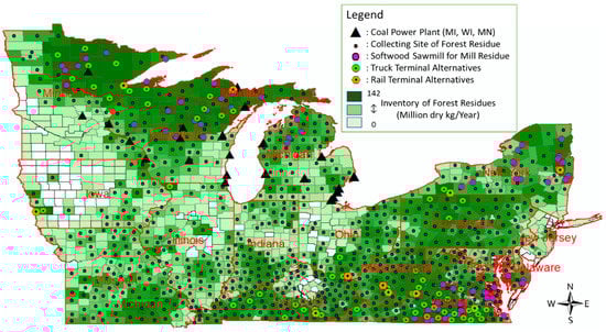 - Ko, S.; Lautala, P. Advanced Woody Biomass Logistics for Cofiring in Existing Coal Power Plant: A Case Study of the Great Lakes States. Transp. Res. Record 2018, in press. [Google Scholar]