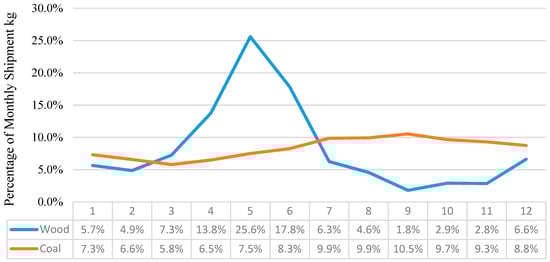 We compare the actual monthly variations of supply shipments for wood and coal (Figure 5). The monthly breakdown of woody biomass and coal shipments within each time period is also given in the bottom of the figure. The seasonal variation in wood shipment data is estimated based on actual flow data from three log satellite yards in the Great Lakes States region. We assumed that maximum quantity of forest residue usable within each time period () is limited to the monthly percentage of forest residue shipments in that time period. The coal supply data is based on 26 existing coal power plants located in the same region [38].
