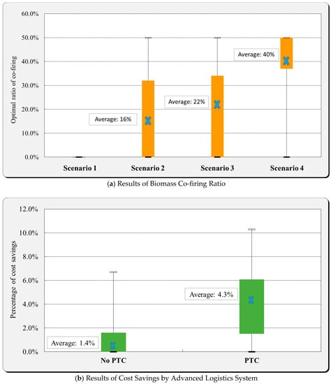 Biomass co-firing ratio and cost savings by changing logistics system. (a) Results of Biomass Co-firing Ratio; (b) Results of Cost Savings by Advanced Logistics System. PTC, production tax credit.
