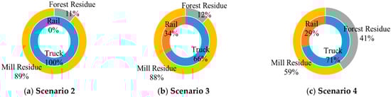 Figure 7 also illustrates the breakdown of feedstock and transportation modes used in each scenario. The figure reveals that mill residue is the preferred feedstock in all scenarios, mainly due to its higher energy density. As the need for biomass feedstock increases, so does the portion of forest residues, mainly due to limited availability of mill residues. Truck is the dominant transportation mode for all co-firing scenarios, but both scenarios that use advanced logistics (3 and 4) also use noticeable amounts of rail shipments.