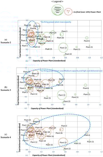 Scenario 1 is excluded from the analysis, as no co-firing is used by the plants. Figure 8a demonstrates co-firing in scenario 2 (conventional logistics system with tax credit). The figure reveals that the plants using over 10% of co-firing are mainly those with low capacity. This indicates that tax credit with conventional logistics system would facilitate the use of biomass, but the effect would be limited to the smaller power plants. For the case of advanced logistics system with no tax credit (Figure 8b), co-firing is extended to the power plants that have medium level of capacity. However, power plants with low delivered cost of coal use no co-firing. In the scenario 4 (Figure 8c), majority of power plants use biomass co-firing. Only a few small plants (plant 11, 21 and 22) with low delivered cost of coal and limited availability of biomass in the vicinity are left outside co-firing.