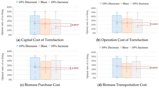 Figure 9 illustrates the changes of optimal level of co-firing based on ±10% cost variations, indicating both the average and the 25%/75% values. The 10% of cost change of an individual parameter has an overall effect of 3.7–7.2% point in the co-firing ratio. This percentage indicates the average change for all 26 coal power plants. The percent change on individual power plants varies. Based on the figure, variation in capital and operation cost for torrefaction in the depots have the greatest effect on the overall level of co-firing ratio. For example, if capital and operational cost of torrefaction changes by ±10%, the average co-firing ratio for all 26 power plants would change on average by 6.9% and 7.2% point, respectively (Figure 9a,b). On the other hand, ±10% change of biomass purchasing cost would lead to comparatively smaller average change of 3.7% point of biomass co-firing (Figure 9c). Biomass transportation costs (both truck and rail) are also less significant than costs related to torrefaction process (Figure 9d).