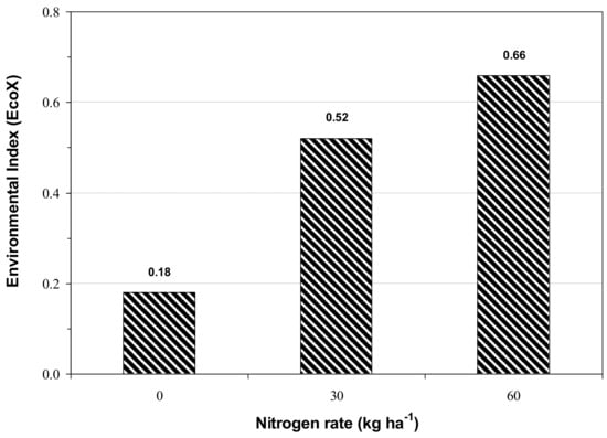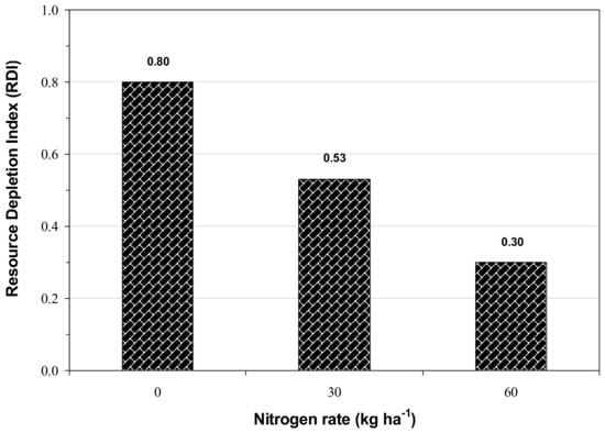 After the classification of the normalization results presented in Table 8, EcoX was calculated for the production of one ton of peanut yield, as shown in Figure 1. The EcoX per one ton of peanut production including global warming, acidification, and terrestrial eutrophication was 0.18, 0.52, and 0.66 at the N rates of 0, 30, and 60 kg ha−1, respectively. Overall, the environmental impact categories (global warming potential, acidification potential, and terrestrial eutrophication potential) were the most harmful to the environment at higher N rates than the non-fertilized control. In another study in Guilan Province, it was reported that a N rate of 52 kg ha−1 resulted in EcoX of 0.62 per one ton of peanut production [12]. In a wheat production system treated with 144 kg N ha−1 and considering four environmental impacts (i.e., global warming potential, acidification potential, terrestrial eutrophication potential, and land use change), the EcoX was estimated at about 0.2 [27]. Brentrup et al. [40] asserted that the EcoX was low under N rates of as low as 150 kg ha−1, but it was sharply increased as N rate was increased from 200 to 390 kg ha−1. The RDI per one ton of peanut production was found to be 0.80, 0.53, and 0.30 at the N rates of 0, 30, and 60 kg ha−1, respectively, when the consumption of diesel fuel, phosphate, and potassium was taken into account (Figure 2). In another study, the RDI was estimated at 3.61 and 2.69 for a peanut monocropping system and peanut-bean intercropping system, respectively [39].