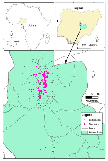 On the other hand, there is limited literature on the socio-economic contribution of small-scale fish farming and attendant fishing practices which are aquaculturally-based, thus aiming towards increased productivity and profitability in some of the urban areas in Nigeria. Such activities are undertaken by local farmers who are either operating alone on a non-formal basis, or formally, as members of local agricultural cooperatives. More research in this study area is highly warranted, as it would help to identify factors that are constraining increased farming productivity and personal incomes, as well as the kinds of policy interventions that are required to stimulate such farming so that urban poverty and food insecurity are reduced. In responding to this research gap, the role of small-scale fish farming as a livelihood strategy by urban farmers in the city of Jos has been investigated in this paper. Addressing this main aim was undertaken by means of formulating the following research objectives: (1) to characterize the spatial distribution of fish farm sites in the city of Jos; (2) to explain farmer’s perceptions on the role of urban fish farming on their own social and economic conditions; (3) to explain existing fish farming practices and characteristics; (4) to summarize the employment patterns relevant to fish farming; (5) to describe perceptions on the most important problems confronting fish farmers, as well as attendant environmental impacts of this activity; and (6) in order to gauge the order of severity and intensity of these problems, some measure of ranking was calculated based on analyses of the feedback obtained from respondents. In giving a theoretical contextualization for urban fish farming in Africa, a brief literature study is provided, and thereafter, a description of the study area, research design, and methods is provided. Then, the results of the study are presented and discussed before conclusions and recommendations are given.