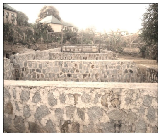 Sixty eight percent of respondents practiced fish production on family-owned land (Table 2). However, relatively few respondents use either their own land (28%) or rented land (4%). Apart from these trends, 82% of respondents also practice fish farming at other locations. Most (68%) of the respondents work on their farms for about seven days per week (Table 2), and 48% of them are occupied by this activity on a full time basis. These findings clearly demonstrate the commitment of the respondents to small-scale fish farming, and how important is this activity to their livelihoods. Those respondents with more than 500 fish per pond constituted 68% of the total, whereas those with 301 to 400 fish amounted to 8%. Regarding the number of fish ponds on individual farms, the majority (68%) of respondents had 6–10 ponds. Different types of ponds utilized by fish farmers are shown in Figure 2, Figure 3 and Figure 4. Most (70%) of the respondents practiced fish production in concrete ponds (built vertically up from the ground with cement blocks), as shown in Figure 3. Furthermore, the average mass of fish sold by 90% of the respondents was 2 kg or less per buyer (Table 2). Large masses of fish were seldom (4–6%) sold to individual buyers.