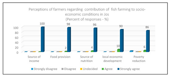 The different perceptions regarding the socio-economic contributions of urban fish farming towards the improvement of social and economic conditions in Jos are portrayed in Figure 5. All respondents strongly agreed that fish farming is serving as a source of income to them, while most (98%) mentioned that this activity is providing food for the urban population. In addition, 96% of respondents expressed strong views that fish serves as a good source of nutrition for people. Moreover, many of them (90%) strongly agreed that urban fish farming is contributing positively towards local economic growth in the Jos metropolis.