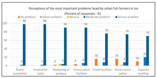Furthermore, most (74%) of the fish farmers in Jos who were included in this study lamented the lack of supportive government policies for enabling fish farming in the region, let alone subsidizing their production costs. However, the severity of this problem was less intense, as it was ranked number 4 based on the analyses of feedback from respondents. This situation is similar to the findings expressed by Mwangi as well as Shitote et al. [80,81], who stated that there are no supportive government policies for sustaining fish farming in Kenya. The lack of capacity building and training opportunities for small scale fish production was regarded as a very serious problem by 70% of respondents in Jos (Figure 6). This implies that these farmers are not adequately informed and enabled vis-a-vis the more recent, effective, and efficient modern methods for successful fish farming, thus disadvantaging them from reaching increased productivity levels. Nonetheless, this problem was the least severe, as it occupied the fifth rank in terms of the order of importance. Previous research findings in Kenya and Tanzania [82,83,84] also indicated that inadequate training programs, ineffective extension services, and inefficiency in disseminating technological knowledge to fish farmers are retarding the development of fish-related industries in these developing nations.