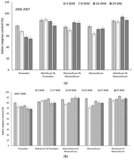 The percentage control of diclofop-resistant Italian ryegrass by the single application of pinoxaden was the lowest amongst the other herbicide programs evaluated. More specifically, the control of Italian ryegrass 4 WAE was 75% in 2006–2007 (Figure 3a) and the lowest was 39% in 2007–2008 (Figure 3b). This activity declined with time in both years.