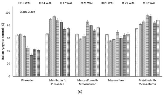 (a) Effects of herbicide program on percentage Italian ryegrass control in 2006–2007 experimental period. Vertical bars represent LSD at 5% significance level (LSD for 4, 8, 16 and 24 WAE = 5, 9, 9, 15 respectively); (b) Effects of herbicide program on percentage Italian ryegrass control in 2007–2008 experimental period. Vertical bars represent Least Significant Difference (LSD) at 5% significance level (LSD for 3, 17, 19, 22, 27 and 32 WAE = 3, 5, 6, 3, 9, 8 respectively); (c) Effects of herbicide program on percentage Italian ryegrass control in 2008–2009 experimental period. Vertical bars represent LSD at 5% significance level (LSD for 10, 14, 17, 21, 25, 29 and 32 WAE = 2, 3, 5, 5, 5, 6, 6 respectively). LSD = Least Significant Diffrence, WAE = Weeks after emergence, DAE = Days after emergence.