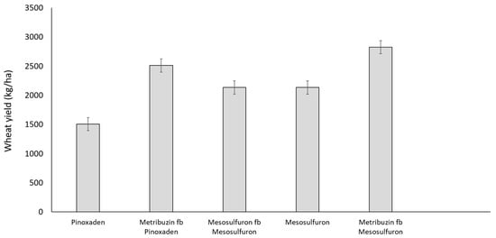 The effectiveness of herbicide treatments was reflected on wheat grain yield as plots that received only a single pinoxaden application produced the lowest wheat yield, averaged across the years and tillage systems, equal to 1505 kg ha−1 (Figure 2) compared to the other treatments. The plot treated with metribuzin fb mesosulfuron yielded highest (2825 kg/ha). A single application of mesosulfuron resulted in 30% more grain yield (2134 kg/ha) compared to a single application of pinoxaden.
