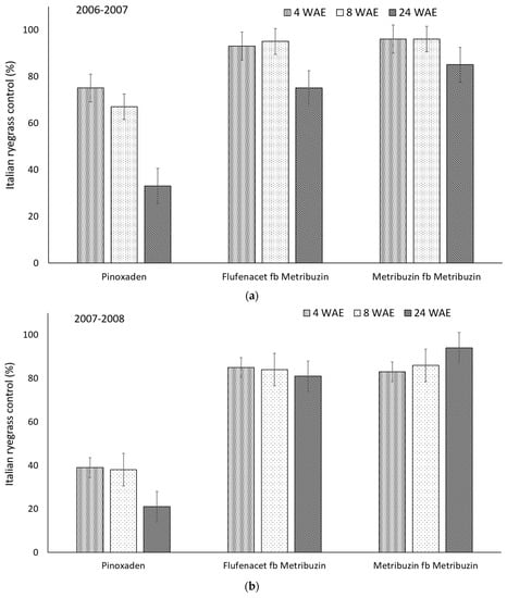 Flufenacet fb metribuzin controlled Italian ryegrass 93% four [4] WAE in 2006–2007, declining to 75% at 24 WAE (Figure 3a). On the contrary, the efficacy of this treatment remained at 81–85% throughout the entire 2007–2008 growing season.
